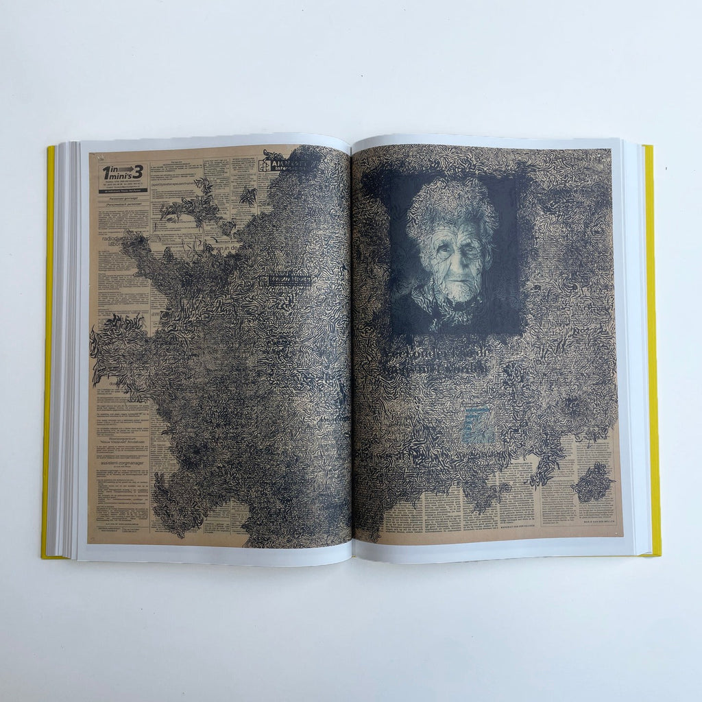 This book is a catalogue of Kees’ ongoing project, spanning over forty years, in which he responds to newspaper spreads with his own artworks. The responses vary: sometimes a headline inspires him, sometimes a striking photo, and sometimes a major news event. In all cases, Kees layers his art directly onto the spread that caught his attention.